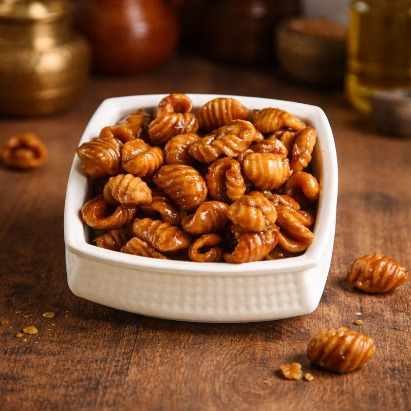 Crispy, hard gavvalu sweets coated with rich jaggery syrup, offering a perfect traditional crunch and sweetness.