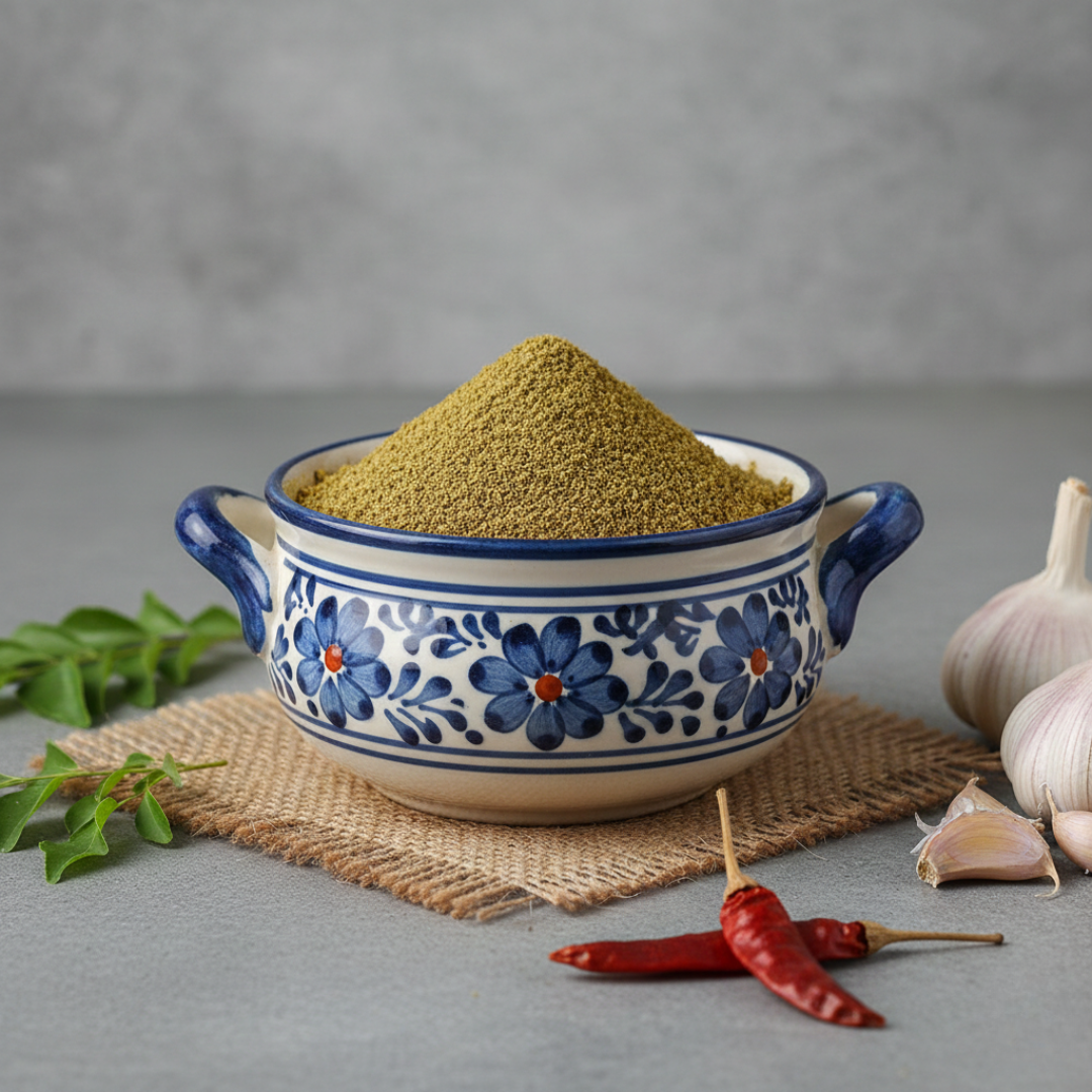 Munagaku Karam (Drumstick Leaves Powder) is a traditional Andhra-style spice powder made from dried munagaku (drumstick leaves / moringa leaves), known for its earthy, mildly bitter, and spicy flavor.