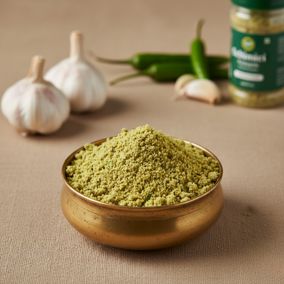 Pachi Mirchi Karapodi is a traditional Andhra-style spice powder made from fresh green chilies, known for its vibrant spicy, aromatic, and slightly tangy flavor.